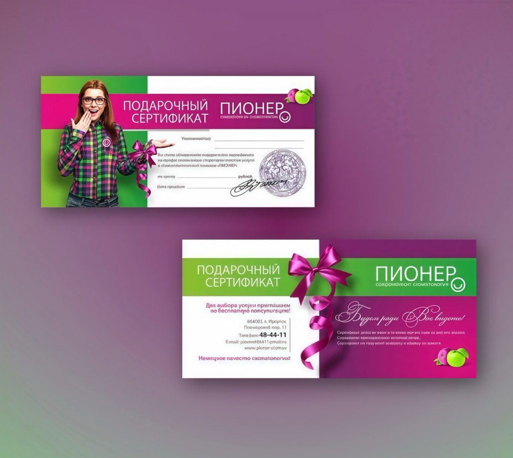 Пионер предлагает идеальное решение – ПОДАРОЧНЫЕ СЕРТИФИКАТЫ на стоматологические услуги! А к Новому году мы подготовили для вас особенные бонусы:При покупке подарочного сертификата на сумму от 3000 рублей: